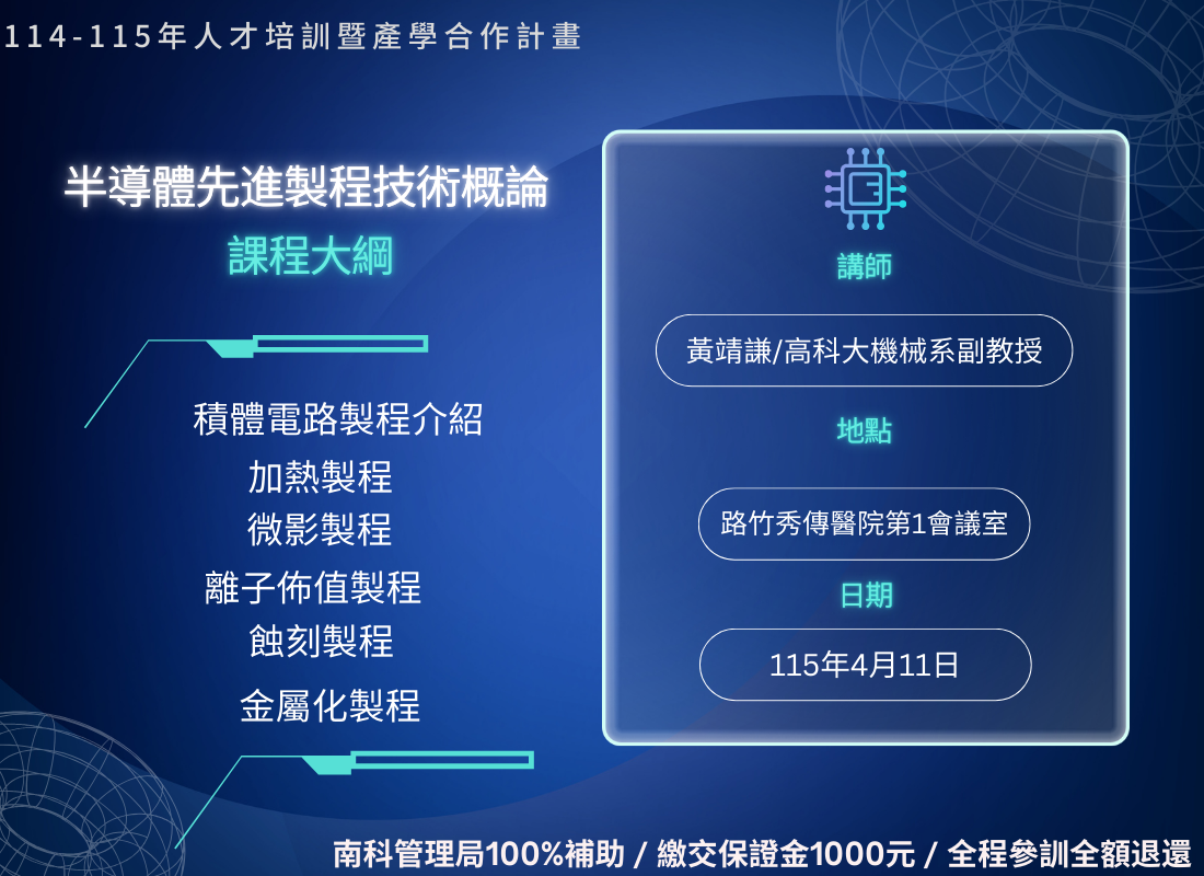 本課程旨在建立學生對半導體元件製作之基礎認知與整體技術架構的理解。內容涵蓋積體電路的發展歷史與基本概念、晶體成長與晶圓製造流程、矽晶圓的物理與材料性質、積體電路主要製程技術、CMOS製程原理,以及半導體技術的未來發展趨勢。 |