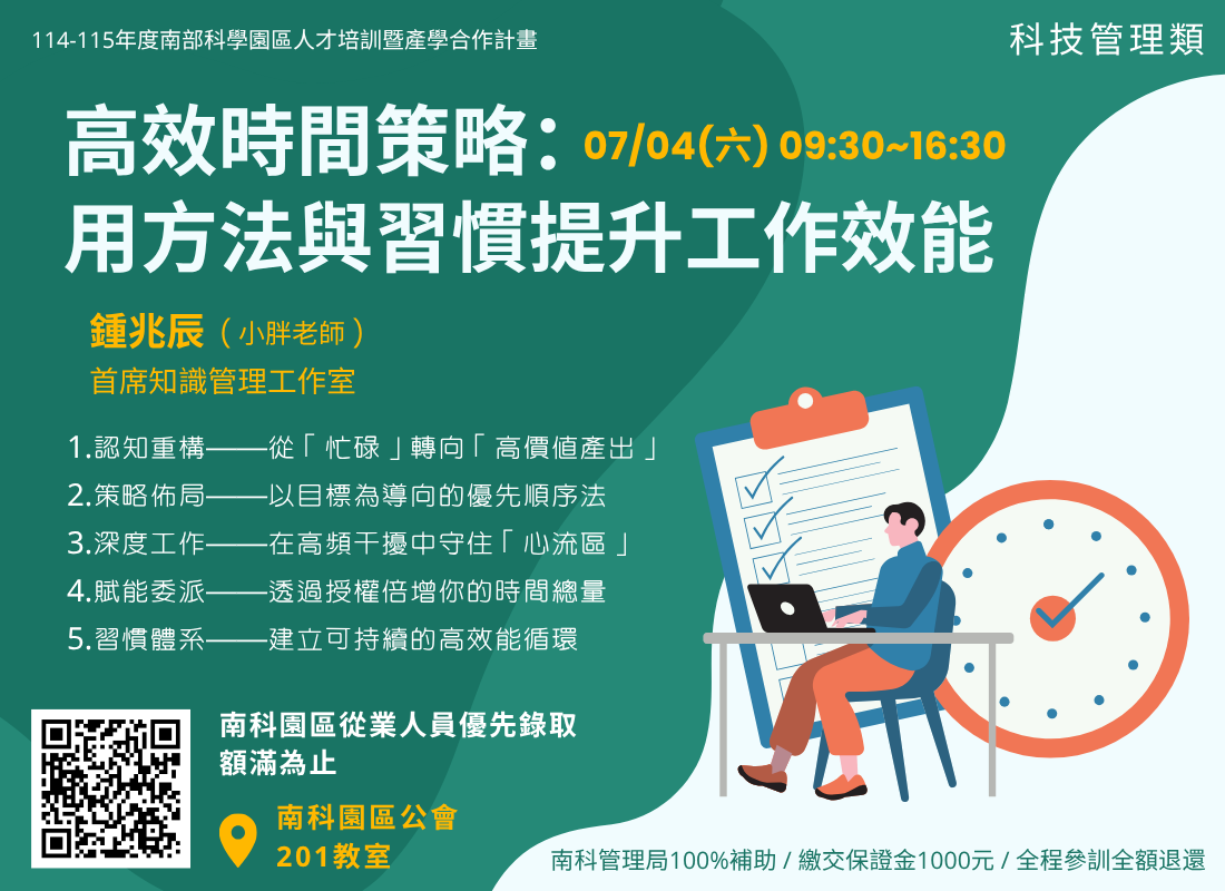 2.政府補助園區在職進修,請先預繳保證金,出席達80%以上者,全數歸還,未達者將不予退還。