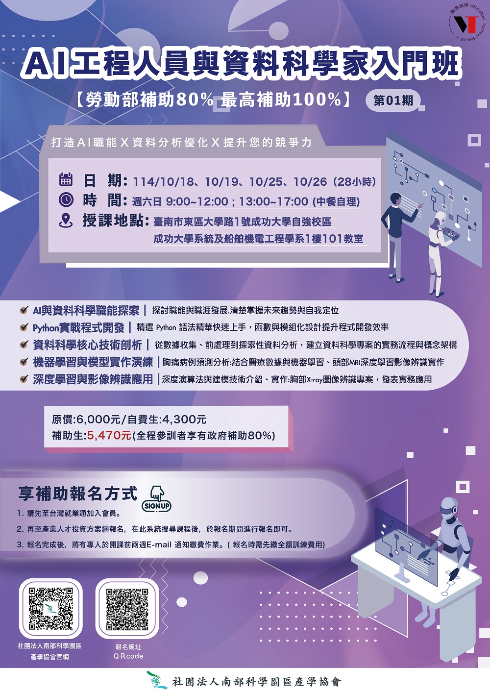 全額優惠補助課程(勞動部產投)年度唯一!AI職涯升級必修!AI工程人員與資料科學應用班第01期~開始報名囉