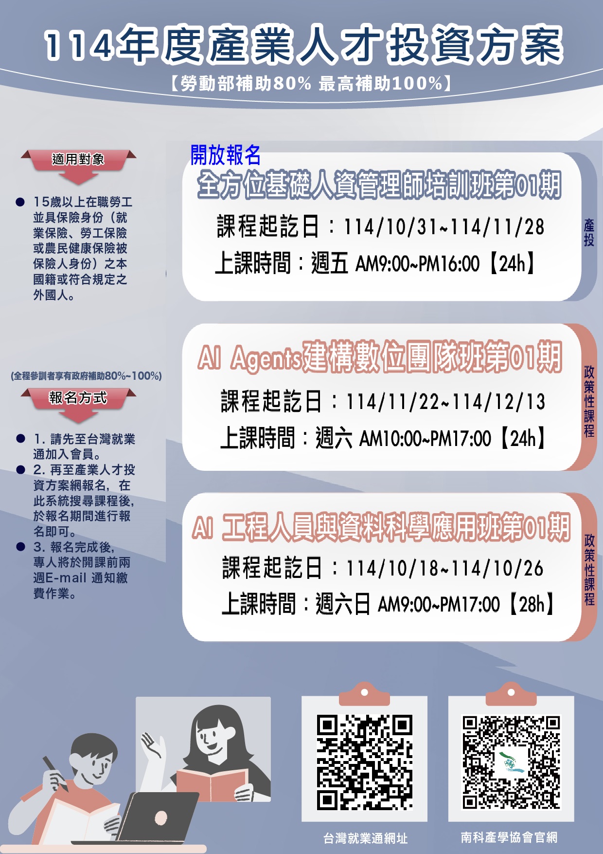 學員登入 註冊會員 忘記密碼 活動訊息 活動訊息 協會活動 會員活動 策略聯盟 成功大學產學創新總中心 成大工程科技推展中心 台灣科學工業園區科學工業同業公會 中華人事主管協會 活動訊息 首頁>活動訊息>活動訊息>會員活動 活動名稱【勞動部資源】114年度10月份產業人才投資計畫即將展開~ 日期2025年06月15日~2025年11月30日 轉寄好友 友善列印 分享 訂閱產學電子報 活動名稱 【勞動部資源】114年度10月份產業人才投資計畫即將展開~ 活動內容 ~產業人才投資方案一覽~ 屆時報名開放為開課日前一個月起,並至台灣就業通報名 活動時間與地點 時間2025年06月15日~2025年11月30日 上一頁