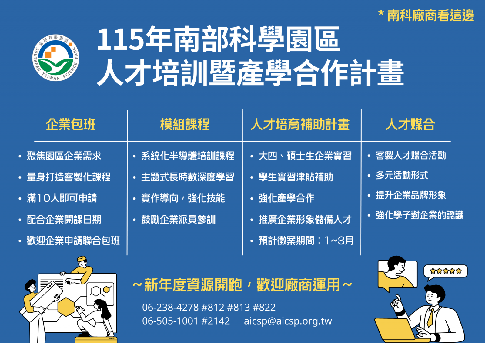學員登入 註冊會員 忘記密碼 活動訊息 活動訊息 協會活動 會員活動 策略聯盟 成功大學產學創新總中心 成大工程科技推展中心 台灣科學工業園區科學工業同業公會 中華人事主管協會 活動訊息 首頁>活動訊息>活動訊息>協會活動 活動名稱【南管局計畫資源】115年南科人才培訓計畫,歡迎南科園區廠商申請 日期2026年01月01日~2026年11月20日 轉寄好友 友善列印 分享 訂閱產學電子報 我要報名 活動名稱 【南管局計畫資源】115年南科人才培訓計畫,歡迎南科園區廠商申請 活動內容 活動時間與地點 時間2026年01月01日~2026年11月20日 我要報名 上一頁