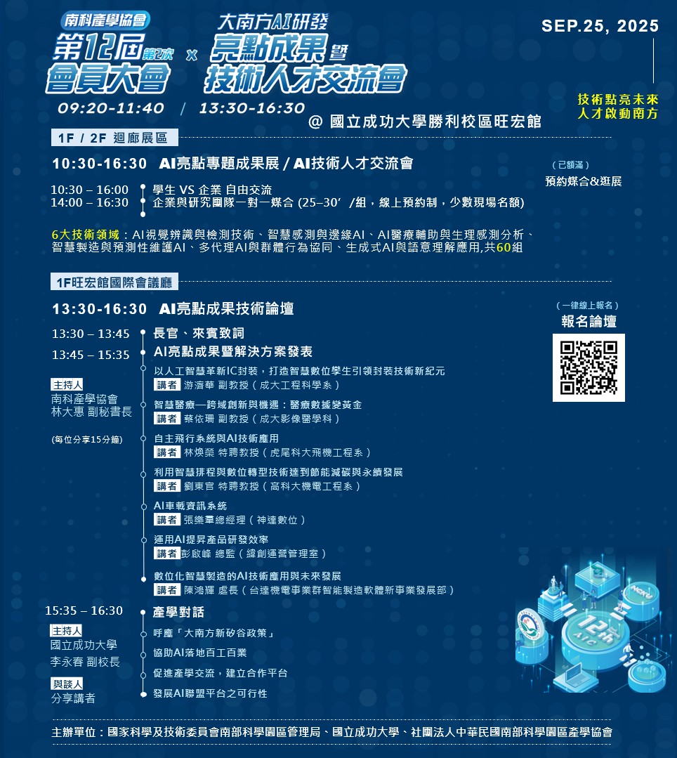 為呼應「大南方新矽谷推動方案」,加速人工智慧於產業端落地應用,本會將於 9月25日(星期四)於南科產學協會第十二屆第二次會員大會後,特別結合南部科學園區管理局及成功大學資源舉辦「大南方AI研發亮點成果暨技術人才交流會」,匯聚南部產官學研資源,展示最新AI成果,搭建技術與人才雙向交流平台,誠摯邀請貴公司蒞臨參與,拓展技術合作機會。