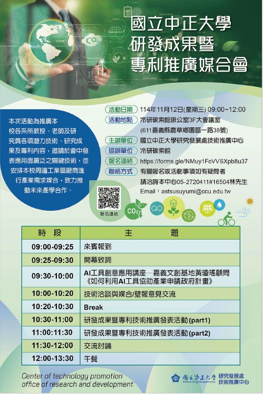 學員登入 註冊會員 忘記密碼 最新消息 最新消息 策略聯盟 台灣科學工業園區科學工業同業公會 經濟部中小企業處南科育成中心 成大技轉育成中心 最新消息 首頁>最新消息>最新消息 消息名稱【活動轉知】敬邀參加國立中正大學-研發成果暨專利推廣媒合會活動 日期2025-10-30 【會員學校_國立中正大學研發成果暨專利推廣媒合會】 敬邀全體會員學校、企業團隊踴躍參加中正大學研究發展處技術推廣中心舉辦之「研發成果暨專利推廣媒合會」,期望促進產業與學界合作。以下提供當天活動議程供參,報名資料請於11/5(三)中午12:00前回填google表單,以利後續行政作業流程需求。 活動時間:114年 11月 12日(星期三) 09:00-12:00 活動地點:冷研碳索館辦公室3F大會議室(611嘉義縣鹿草鄉園區一路38號) 主辦單位:國立中正大學研究發展處技術推廣中心 協辦單位:冷研碳索館 報名連結:https://forms.gle/NMuy1FcVVSXpb8u37 上一頁