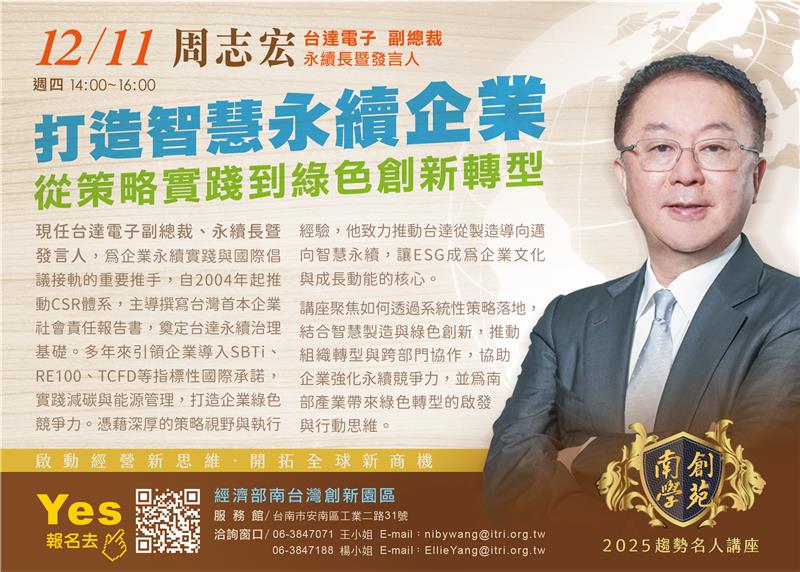 學員登入 註冊會員 忘記密碼 最新消息 最新消息 策略聯盟 台灣科學工業園區科學工業同業公會 經濟部中小企業處南科育成中心 成大技轉育成中心 最新消息 首頁>最新消息>最新消息 消息名稱【活動轉知】12/11(四)南創學苑2025趨勢名人講座:台達電子副總裁暨永續長 周志宏_打造智慧永續企業:從策略實踐到綠色創新轉型! 日期2025-11-14 財團法人工業技術研究院原訂11/13舉辦「趨勢名人講座—打造智慧永續企業:從策略實踐到綠色創新轉型,因颱風影響改期至114/12/11辦理,敬邀本會所屬會員學校、廠商踴躍參加。 講座日期:2025/12/11(四)14:00-16:00 講座地點:經濟部南台灣創新園區/台南市安南區工業二路31號 報名方式:掃描QR code線上報名,免費參加! 報名網址:請點選→連結 南創粉絲團:https://www.facebook.com/sirdptainan/ 洽詢專線:06-3847071 王小姐 nibywang@itri.org.tw 06-3847188 楊小姐 ellieyang@itri.org.tw 上一頁