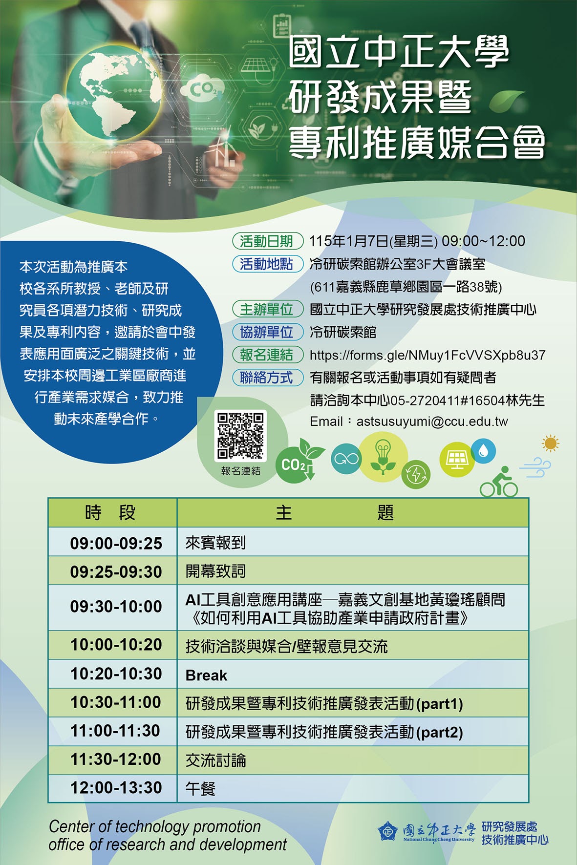 學員登入 註冊會員 忘記密碼 最新消息 最新消息 策略聯盟 台灣科學工業園區科學工業同業公會 經濟部中小企業處南科育成中心 成大技轉育成中心 最新消息 首頁>最新消息>最新消息 消息名稱【活動轉知】敬邀參加115年1月07日(三)國立中正大學-研發成果暨專利推廣媒合會活動 日期2025-11-24 【會員學校_國立中正大學研發成果暨專利推廣媒合會】 敬邀全體會員學校、企業團隊踴躍參加中正大學研究發展處技術推廣中心舉辦之「研發成果暨專利推廣媒合會」,期望促進產業與學界合作。以下提供當天活動議程供參,報名資料請於12/31(三)中午12:00前回填google表單,以利後續行政作業流程需求。 活動時間:115年 1月 07日(星期三) 09:00-12:00 活動地點:冷研碳索館辦公室3F大會議室(611嘉義縣鹿草鄉園區一路38號) 主辦單位:國立中正大學研究發展處技術推廣中心 協辦單位:冷研碳索館 報名連結:https://forms.gle/NMuy1FcVVSXpb8u37 上一頁