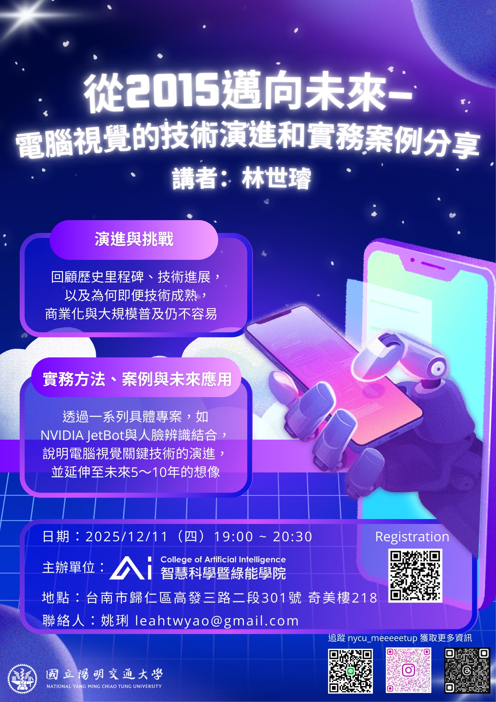 學員登入 註冊會員 忘記密碼 最新消息 最新消息 策略聯盟 台灣科學工業園區科學工業同業公會 經濟部中小企業處南科育成中心 成大技轉育成中心 最新消息 首頁>最新消息>最新消息 消息名稱【活動轉知】國立陽明交通大學辦理 「從2015邁向未來—電腦視覺的技術演進和實務案例分享」活動 日期2025-12-08 活動名稱:從2015邁向未來—電腦視覺的技術演進和實務案例分享 活動時間:12/11(四)19:00-20:30 活動地點:國立陽明交通大學沙崙校區(台南市歸仁區高發三路301號 奇美樓 218) 報名連結:https://docs.google.com/forms/d/e/1FAIpQLSc9CruLir0Lbvya8JpECNHr4Rz1Tk4yhwmpLUJsE95pCleeEA/viewform 上一頁