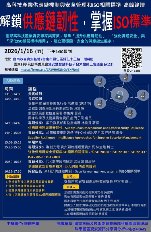 面對快速變遷的全球局勢與日新月異的科技發展,「提升供應鏈韌性」與「強化資通安全」已成為高科技產業刻不容緩的關鍵議題。有鑑於此,群創光電將於 2026年1月16日(五) 13:30-17:30,假 台南沙崙資安基地,盛大舉辦「2026高科技產業供應鏈機制與安全管理和ISO相關標準高峰論壇」。