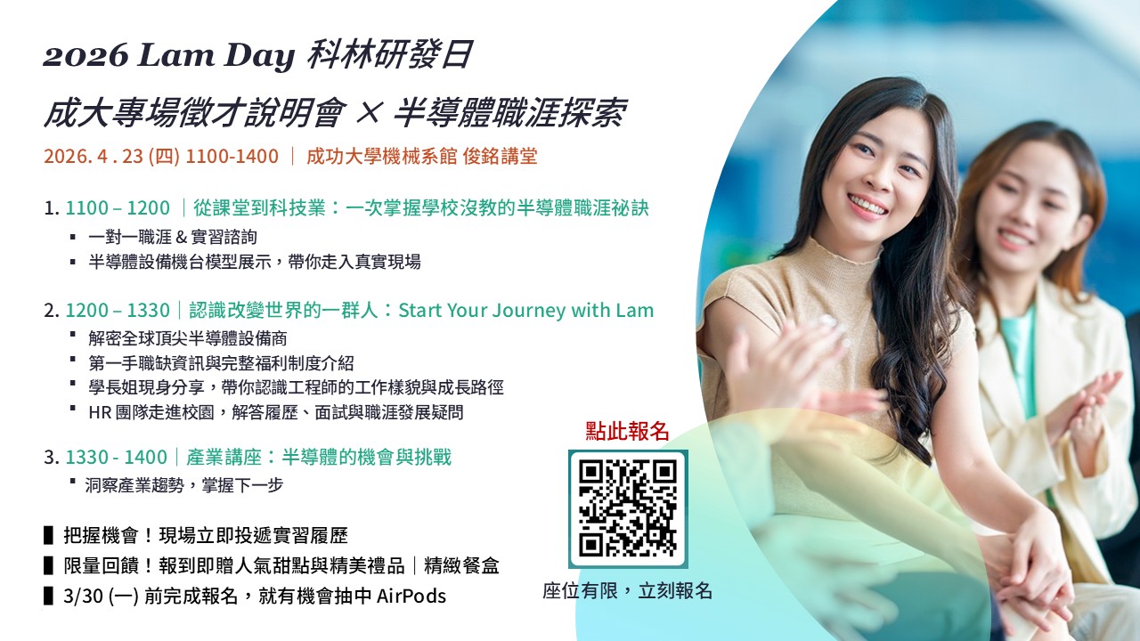 想深入了解半導體產業的第一線趨勢,並探索國際級外商的職涯機會嗎? 美商科林研發(Lam Research) 將於 4 月23 日(四) 走進國立成功大學,舉辦 「Lam Day 科林研發日|成大專場徵才說明會 × 半導體職涯探索日」,誠摯邀請你一同參與!